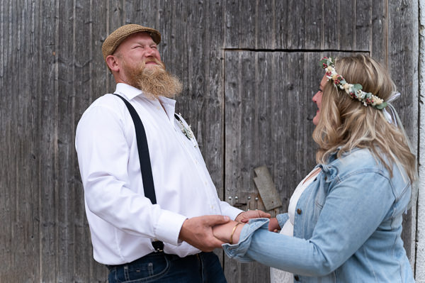 Anschließend ging es weiter zum Hof des Brautpaares, wo Familie und Freunde schon voller Vorfreude auf uns warteten. Es war mir eine große Freude, die liebevolle Verbindung zwischen Lole, Peter und ihren Lieben in warmen, ehrlichen Bildern festzuhalten. Diese familiäre, bodenständige Umgebung hat so gut zur Persönlichkeit der beiden gepasst. Es gab keine steifen Posen – nur echte Emotionen, viele herzliche Umarmungen und lachende Gesichter.
